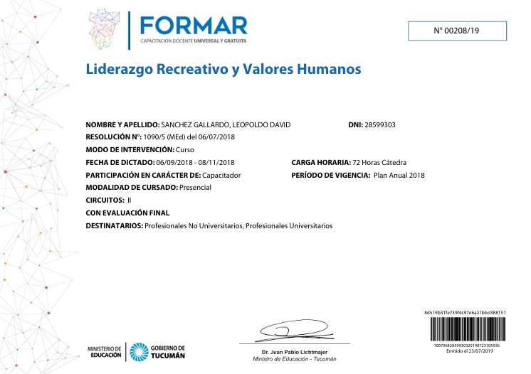 Esta propuesta formativa fue parte del Plan Anual 2018 de la plataforma FORMAR, con aval oficial del Ministerio de Educación de Tucumán. El curso busca potenciar habilidades de liderazgo desde una perspectiva lúdica y humana, aplicadas al ámbito educativo.